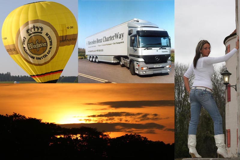 Hier habe ich aus den linken 4 Bildern (LKW, Heissluftballon, Abendhimmel und Frau) einen "Fantasy-Marena-Truck" erstellt. |
