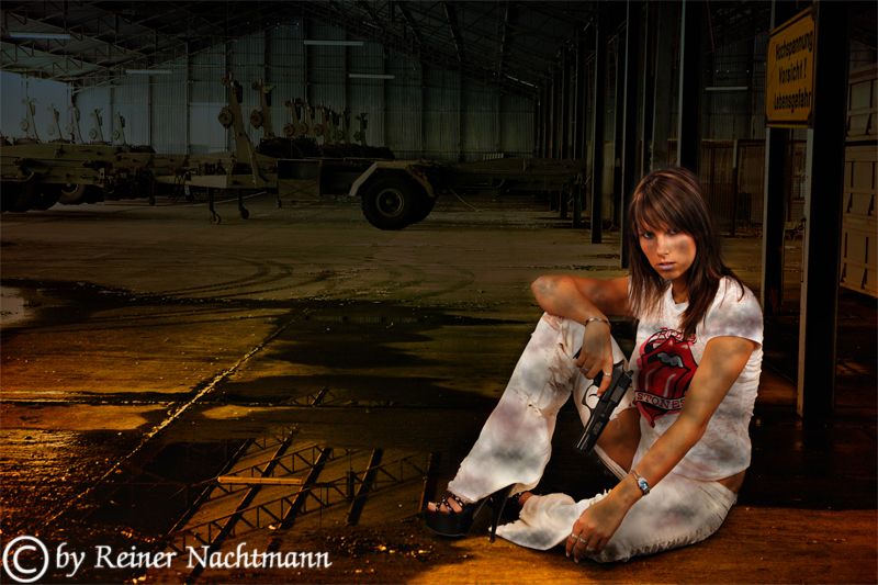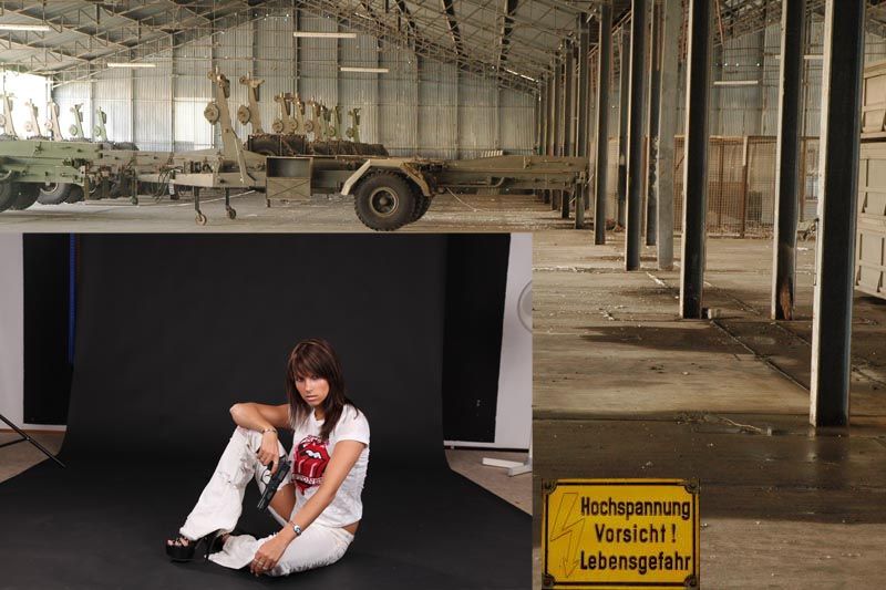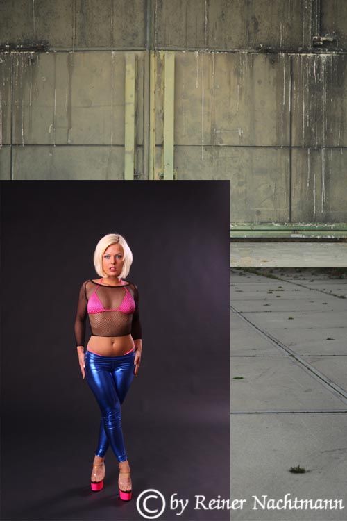 Das Originalfoto des Models wurde von meinem Bruder im Studio aufgenommen, aus der Stahlwand und dem Betonboden fertigte ich den Hintergrund für das Composing.