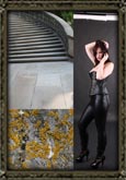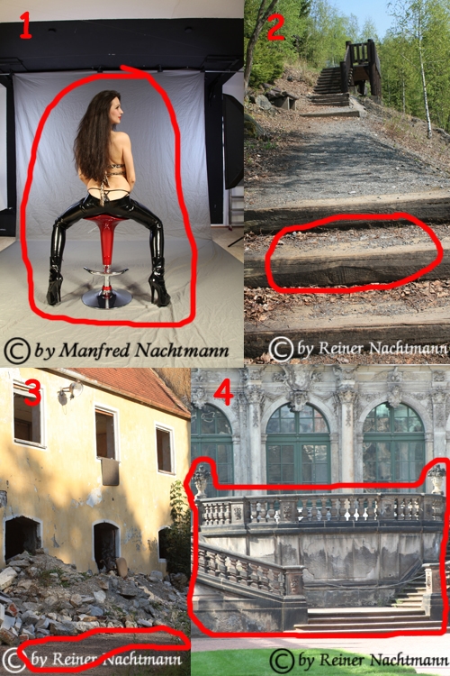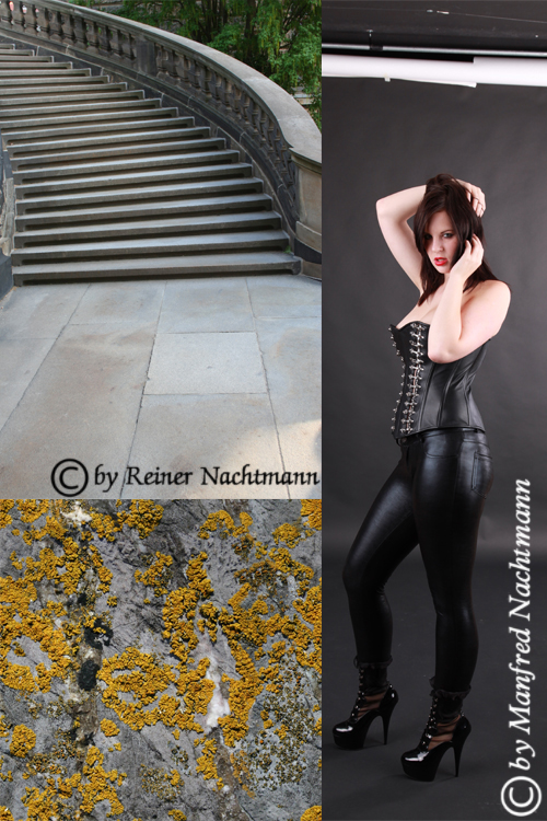 Bei diesem Composing habe ich 2 Outdooraufnahmen (Treppe u. Struktur) und eine Studioaufnahme (Frau) kombiniert.