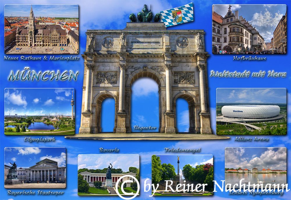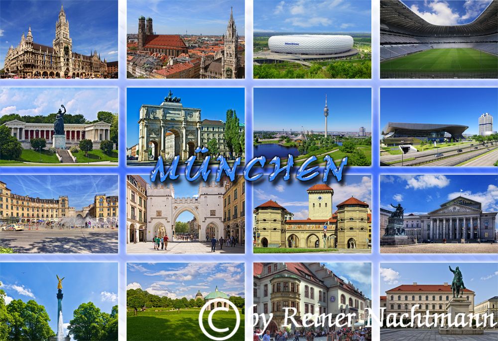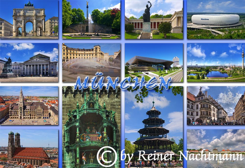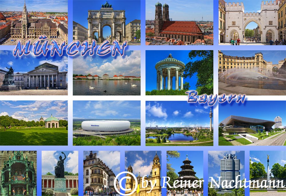 Bei diesen Collagen mit Fotos von München wurde ebenfalls alles von mir erstellt, (die Fotos wurden alle von mir aufgenommen, auch alle Hintergründe von mir erstellt). Die Maße bzw. das Format der Collagen ist so gewählt das man daraus auch jederzeit Ansichtskarten erstellen kann. Die 4 Collagen der unteren Reihe wurden nach bestimmten Vorgaben als Muster für die Buchhandlung Hugendubel in München erstellt. |
