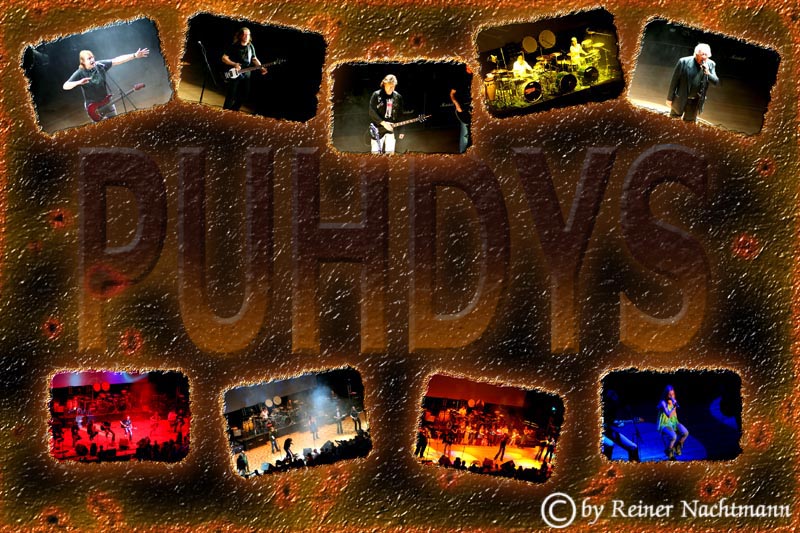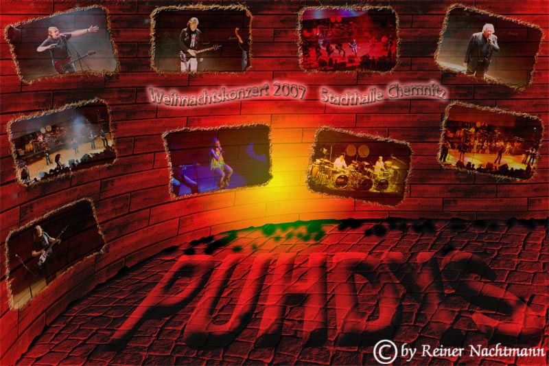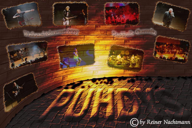 Hier habe ich verschiedene Collagen mit Fotos der Puhdys (Weihnachtskonzert 2007 in der Stadthalle Chemnitz) erstellt. Bei diesen Collagen habe ich sämtliche Schriftzüge sowie die Hintergrünede ( Ziegelwand, Pflastersteine, rostiges Metall) in Eigenregie mit Ebenenstilen und Filtern erstellt. Es wurden keinerlei Fremdfotos oder ähnliches verwendet. |