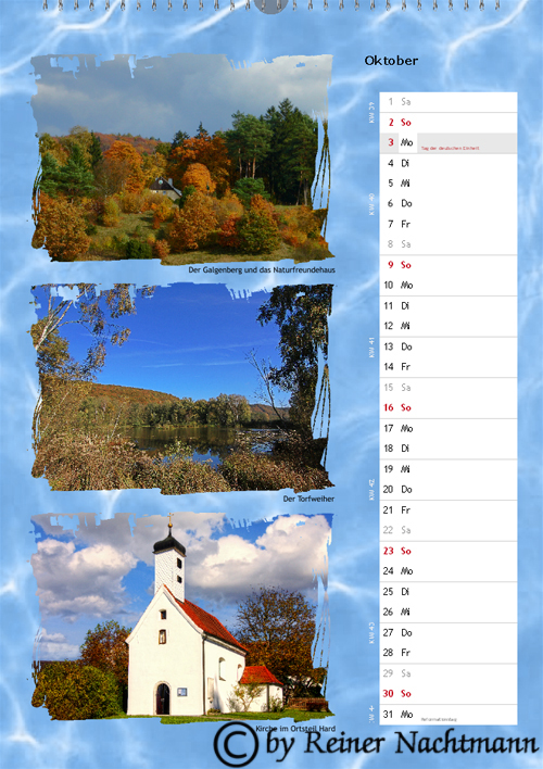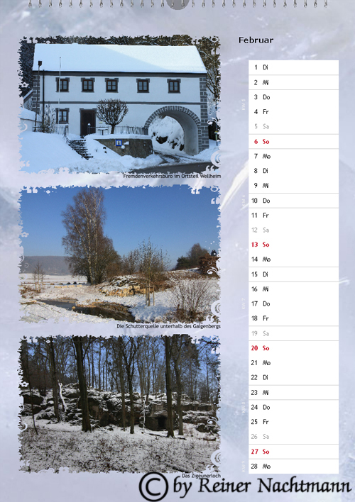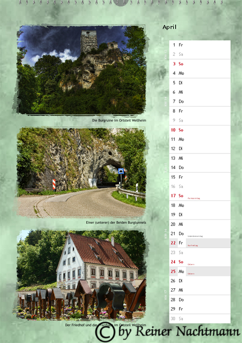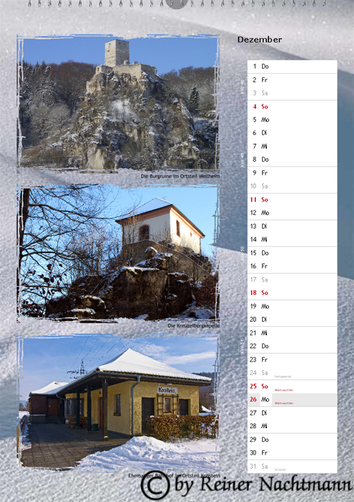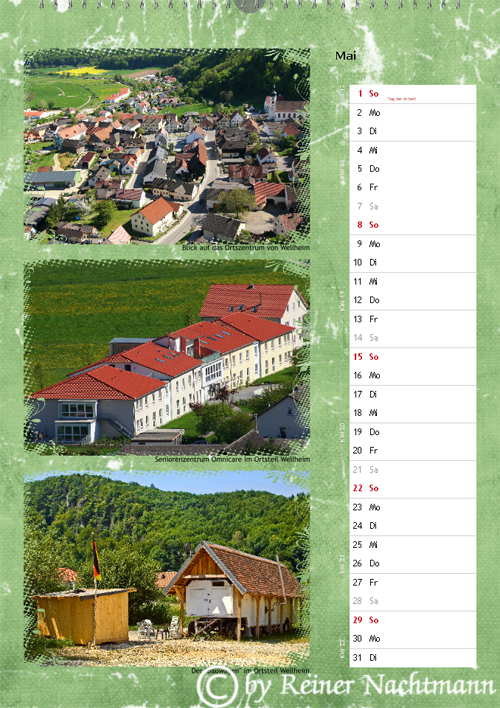 Hier ist Version 2 des Kalenders für das Jahr 2011. Auch bei diesem Kalender verwendete ich ausschließlich Fotos welche ich im und rund um den Markt Wellheim aufgenommen habe.