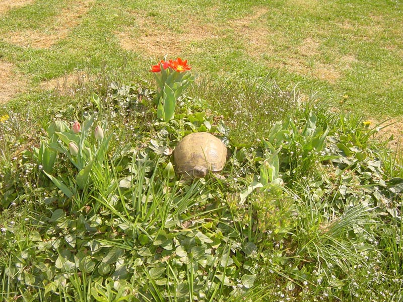 Das ist "Gretchen", Herrn Huhn's Schildkröte. Diese Griechische Landschildkröte besitzt er schon über 20 Jahre. Absolut clever dieses Tier, in der Vergangenheit ist sie ihm schon zweimal entwischt, doch glücklicherweise bekam er sie immer wieder zurück. Einmal war sie sogar längere Zeit verschwunden, es half nur noch eine Zeitungsanzeige mit "Schildkröte entlaufen" die Hr. Huhn aufgab. Und siehe da, nach ein paar Tagen hatte er die Ausreißerin zurück ... aber auch nur nach Zahlung eines "Lösegeldes" !!!